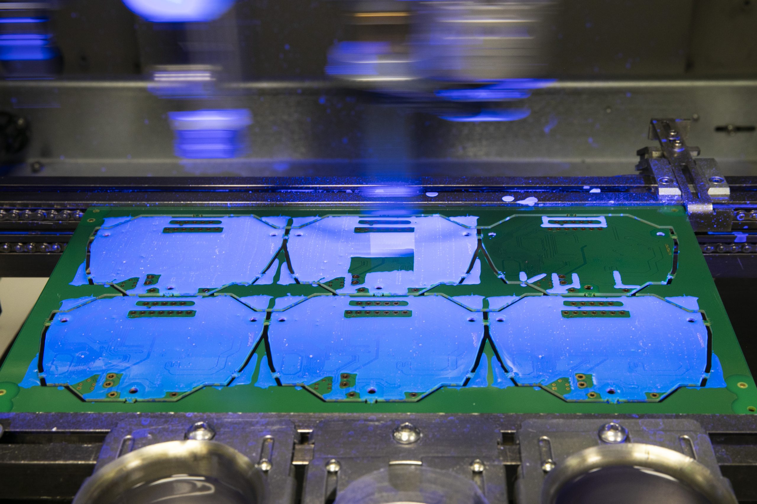 Aplicamos barniz de forma precisa y selectiva en las áreas definidas del circuito.